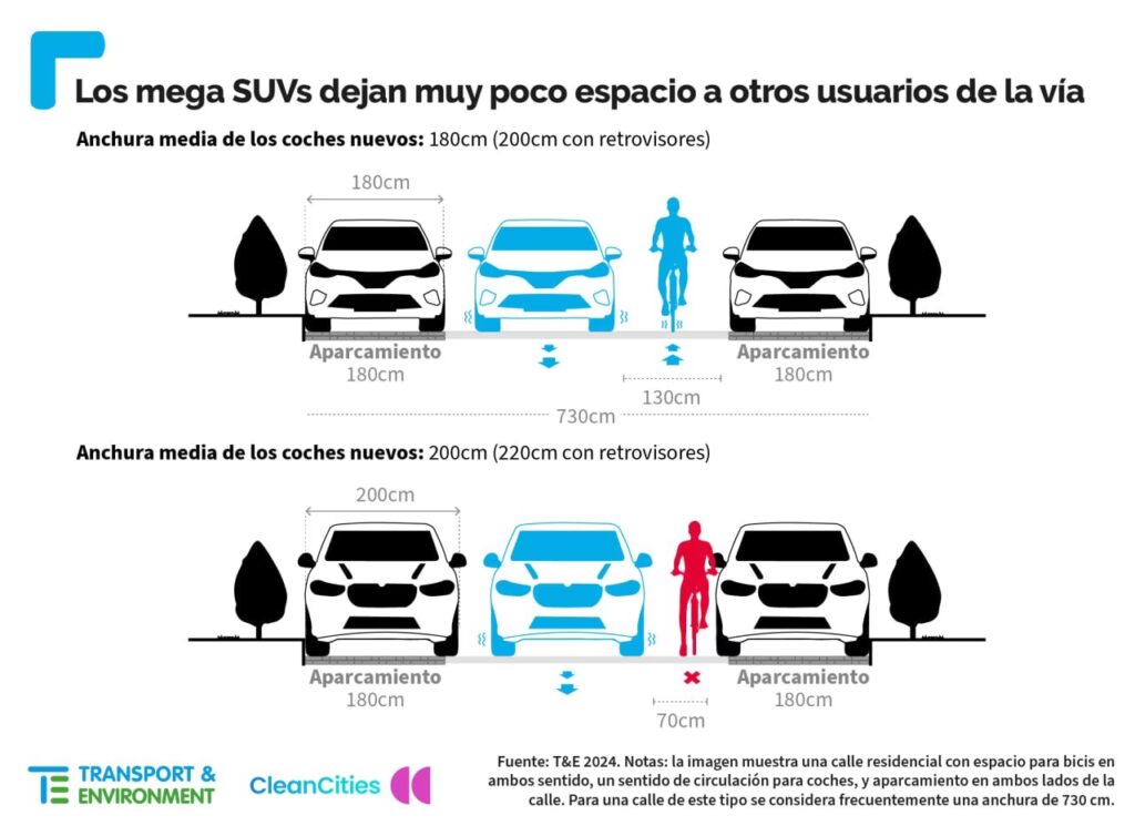 Más allá de las medidas locales, organizaciones como Transport & Environment (T&E) proponen acciones a nivel legislativo europeo. Sugieren que los legisladores de la UE revisen el límite máximo de anchura para los coches nuevos, que actualmente es de 255 centímetros (el mismo que para autobuses y camiones), cuando actualicen la normativa en los próximos meses. Argumentan que este límite, establecido pensando en vehículos comerciales pesados, no es adecuado para turismos y permite el diseño de coches excesivamente anchos. Además, instan a los ayuntamientos a imponer tarifas de estacionamiento y peajes basadas en el tamaño y el peso del vehículo, asegurando que los vehículos más grandes paguen más por el mayor espacio que ocupan.