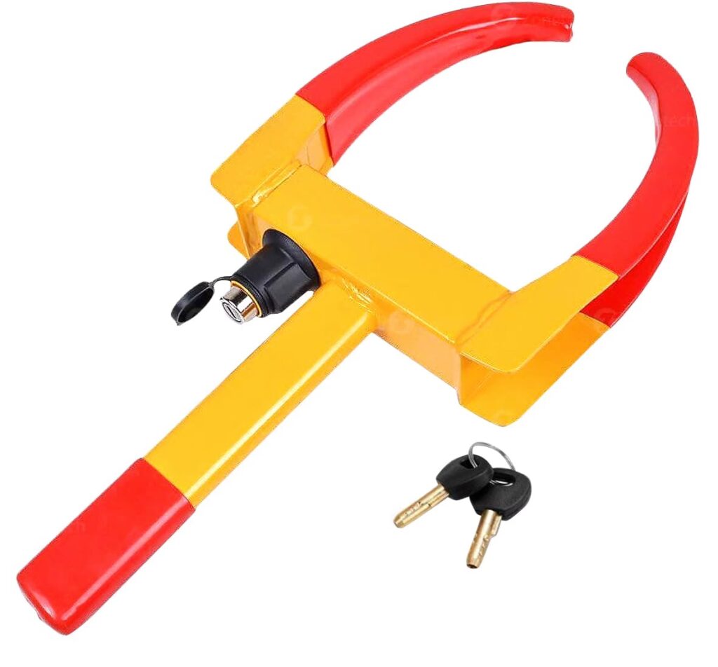 Pasando a otro tipo de dispositivo físico, las abrazaderas de rueda, también conocidas como cepos o inmovilizadores de rueda, son otro método simple pero extremadamente efectivo para disuadir a los ladrones. Su función principal es inmovilizar completamente una rueda del vehículo, impidiendo que gire y, por lo tanto, que el coche pueda ser movido.
