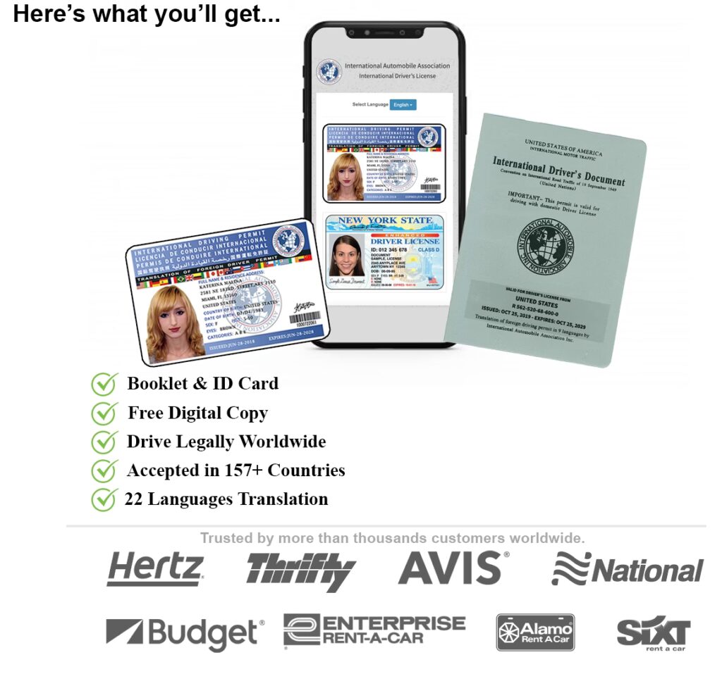 Su IDP es un documento de identidad válido en 150 países e incluye su nombre, foto e información del conductor . Traduce su información de identificación a 10 idiomas, por lo que habla su idioma incluso si usted no lo conoce. La mayoría de los países recomiendan encarecidamente un Permiso de Conducir Internacional.