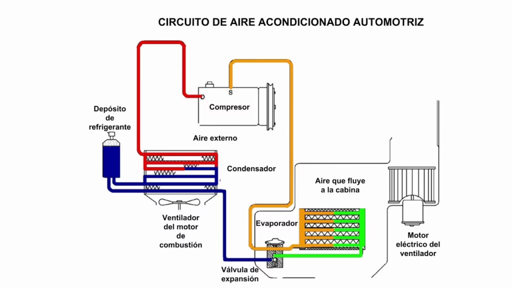 Una vez líquido, el refrigerante pasa por una válvula de expansión, donde su presión y temperatura disminuyen drásticamente. En este estado de baja presión y temperatura, entra al evaporador, ubicado dentro del habitáculo. Aquí, el refrigerante absorbe el calor del aire interior, enfriándolo. El aire ya frío es impulsado por el ventilador hacia las salidas de ventilación del coche.