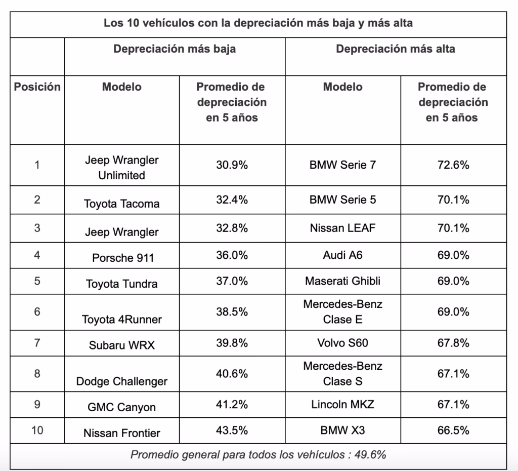 Esta tabla subraya la rápida caída de valor en los primeros años.