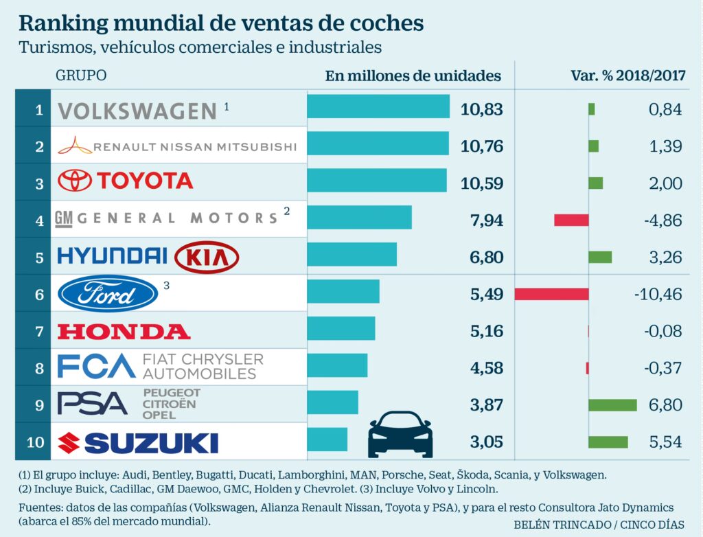 Históricamente, la lucha por el primer puesto en ventas globales ha sido principalmente entre el Grupo Toyota y el Grupo Volkswagen. Ambos conglomerados tienen una presencia masiva en los mercados más grandes del mundo (Asia, Europa, América del Norte) y ofrecen una amplia gama de vehículos que cubren casi todos los segmentos del mercado, desde autos compactos económicos hasta SUVs de lujo y vehículos comerciales.