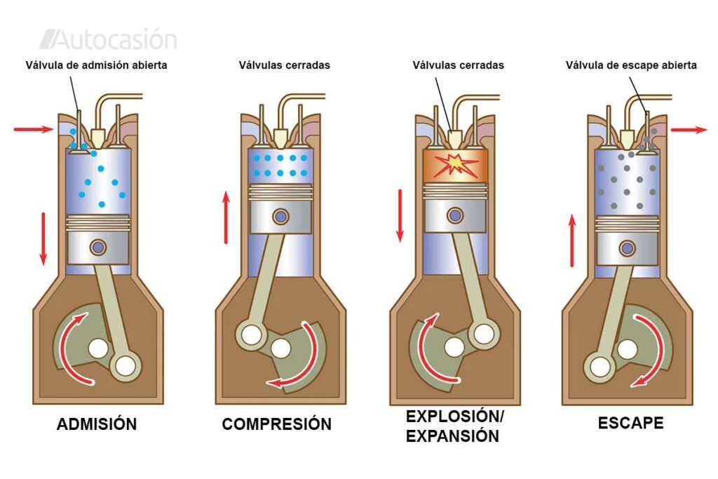 Como se describió detalladamente antes, este motor completa su ciclo en cuatro movimientos del pistón y dos vueltas del cigüeñal. Cada etapa (admisión, compresión, explosión, escape) ocurre por separado. Son más complejos mecánicamente (con válvulas, árbol de levas, etc.) pero ofrecen mejor eficiencia de combustible y menores emisiones que los motores de dos tiempos. Son el estándar en la gran mayoría de los automóviles, camiones y motocicletas de media y alta cilindrada actuales.